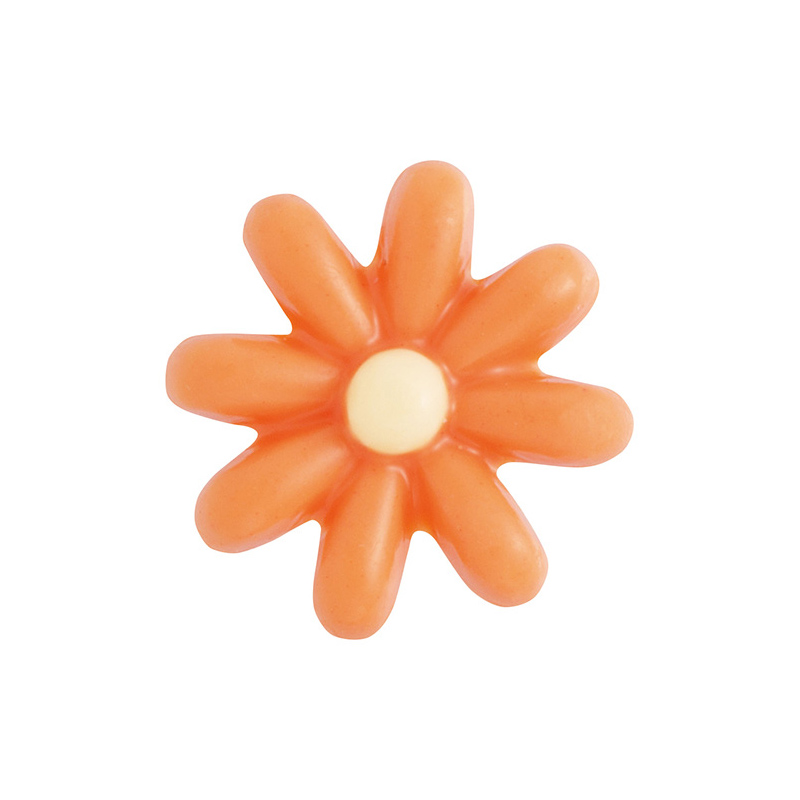 天然着色料でオレンジ色に仕上げています。花の直径は約26ミリで、小さな菊の花を彷彿させるデザインです。カットケーキやカップケーキ等の小さなお菓子の仕上げにお勧め。
