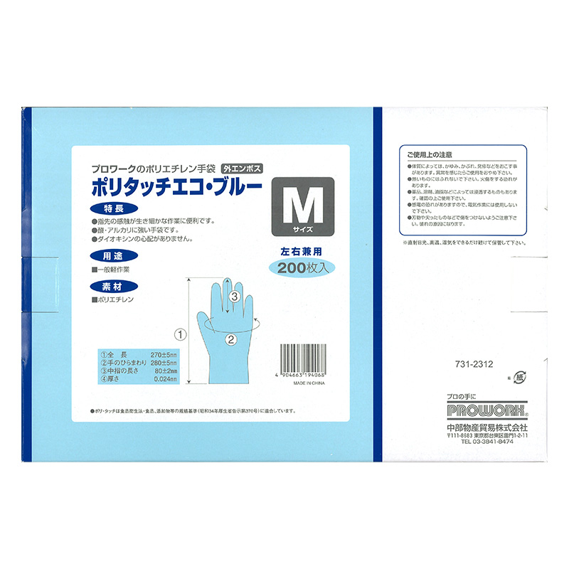 - ポリエチレンの使い捨て手袋です。生地に青い色素を添加することで、万が一の破損による異物混入のリスク改善をしました。食品衛生法・食品添加物の規格基準に適合しています(昭和34年厚生省告示370号)。食品加工だけでなく、酸・アルカリに強く、弱電精密機械業や印刷業などの業務にもご利用いただけます。外側にエンボス加工が施されていますので、比較的すべりにくい仕上げになっています(高濃度の薬品やガソリン、ベンジン類には使用しないで下さい)。ニトリル手袋と比較すると強度が弱く伸縮性が劣るので手にぴったりとフィットしませんが、コストパフォーマンスに優れた商品です。塩素を含んでいませんので、燃やしてもダイオキシンが発生せず環境に優しい素材です。