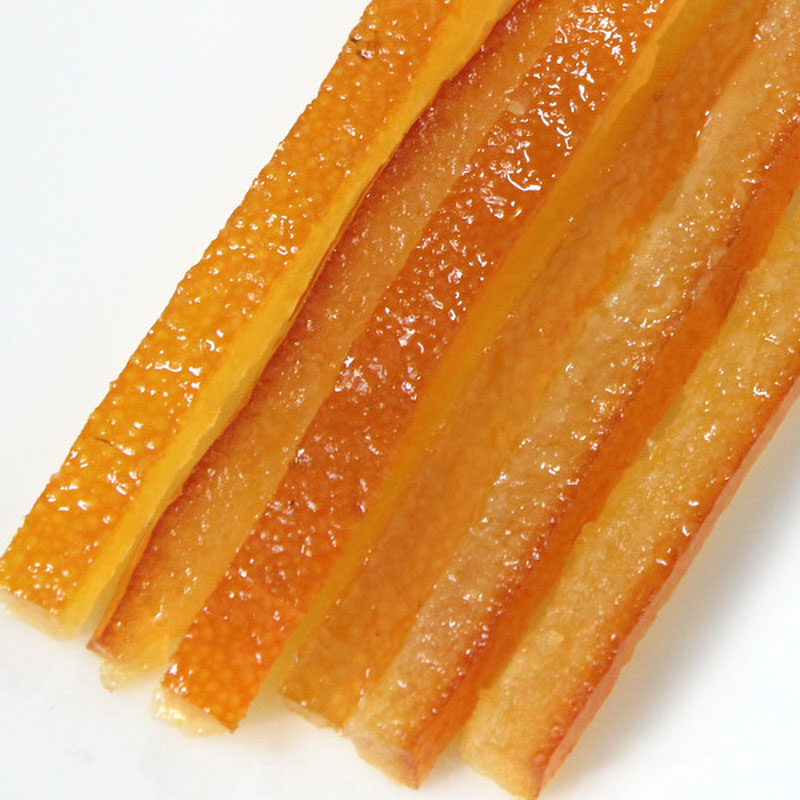 - フランス製の製菓用オレンジピール加工品。スティック状にカットした良質のオレンジの皮を水煮後、じっくりとシロップ漬けしたもの。色が鮮やかで、香り高く、柔らかい食感が特徴です。国産メーカー品と比較して、風味が濃厚でオレンジの香りが強い傾向。チョコレート掛けしてもチョコレートの風味に負けることなく、しっかりとオレンジの風味を主張してくれます。お菓子のデコレーション、ショコラに浸してエギュイエットなどに最適です。